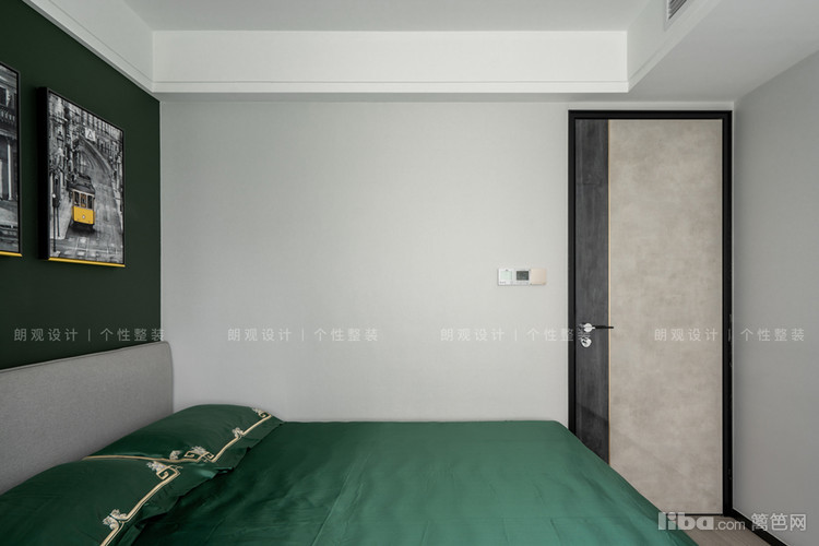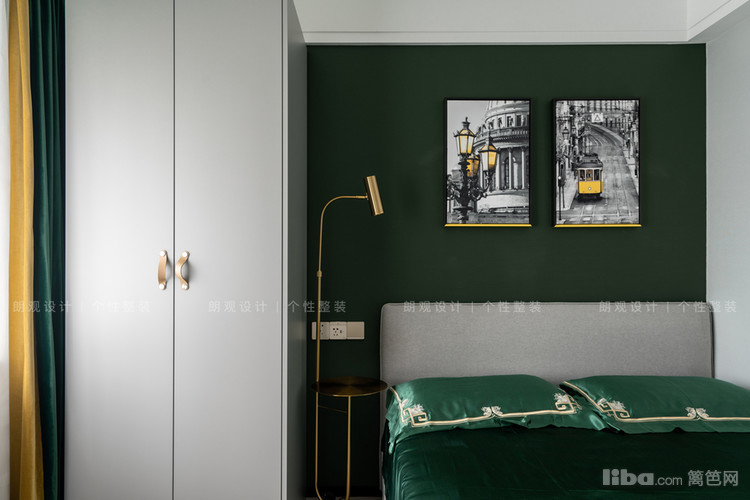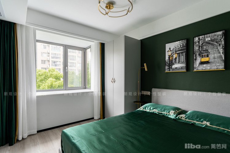 次卧没有纷繁复杂的布景与装饰,一抹孔雀绿墙布轻松勾勒出一方复古的小天地