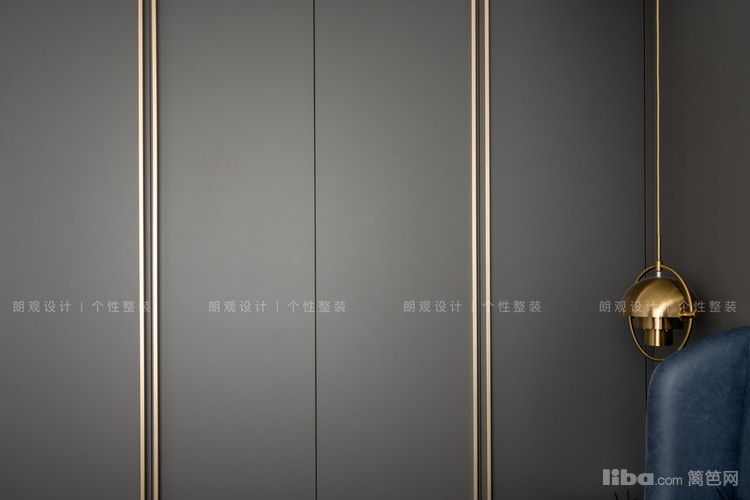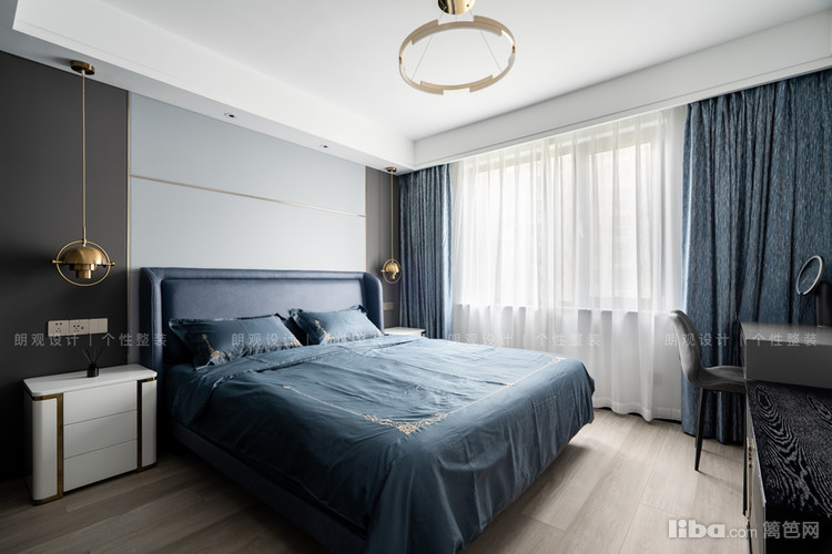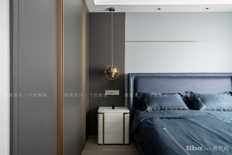 主卧以精致优雅为主,背景墙采用了硬包设计,隔绝噪音的同时,利用淡蓝色与深灰色的碰撞,加上金属条的衬托,营造时尚静谧的休息氛围。