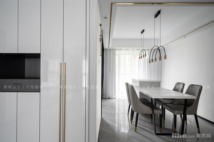北阳台的纳入增加了餐厅空间,所以定制了中岛台和餐桌二合一的用餐区域,中岛也可以补充厨房功能区。