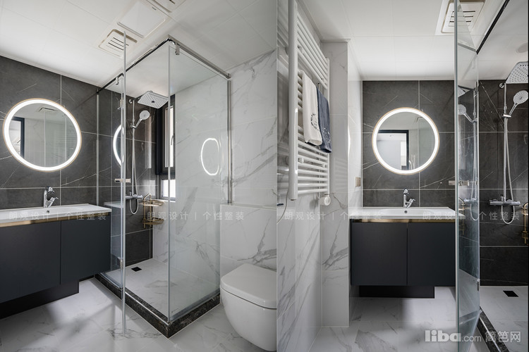 卫生间将现代轻奢风进行到底,黑色瓷砖大面积铺贴让空间深邃神秘,而白色瓷砖和自带LED等的镜体,则负责提亮空间,浴柜上金属条的加入,勾勒出令人迷醉的华丽特质。