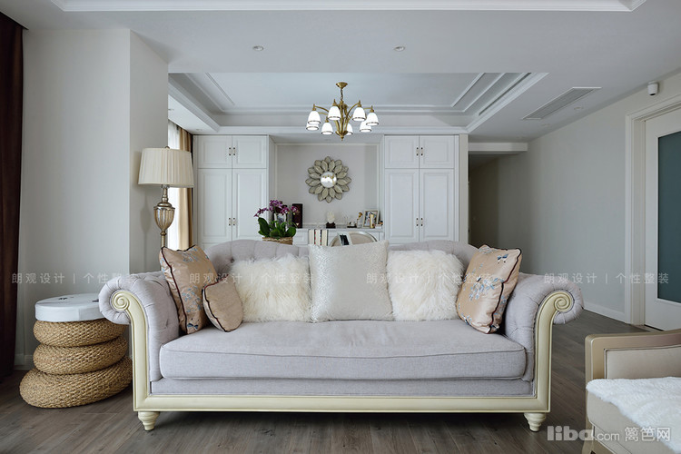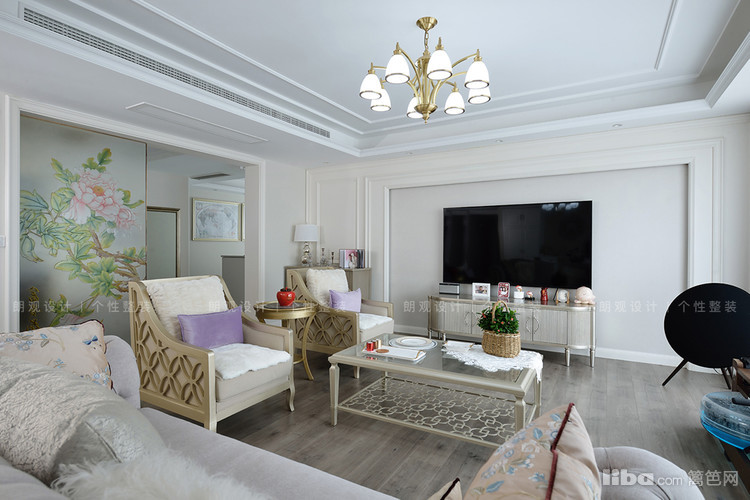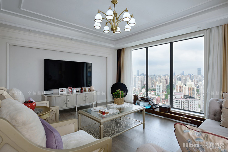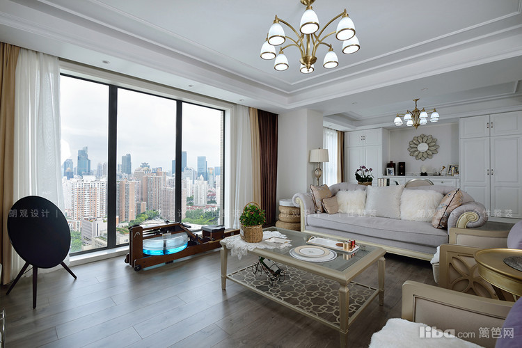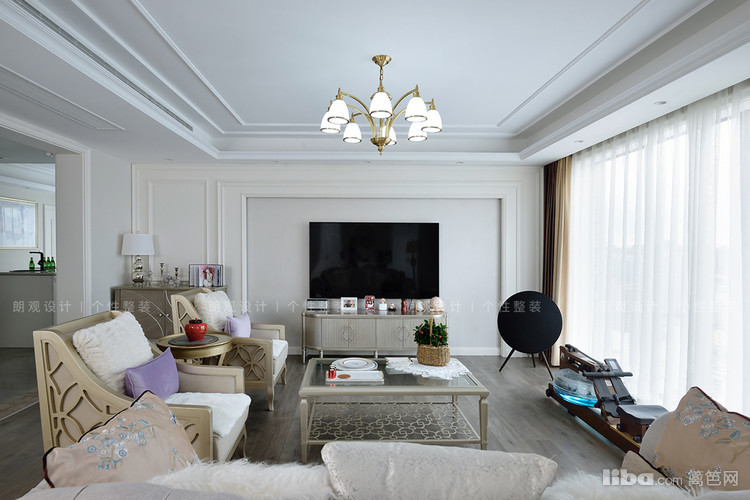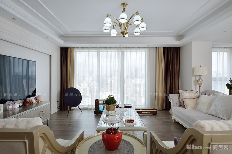 书房与客厅打通后,空间宽敞通透,定制书柜的线条感与电视背景墙相呼应,搭配的吊灯以及装饰物都含有黄铜元素,以提升空间的质感,展现出了美式风格的优雅与精致。