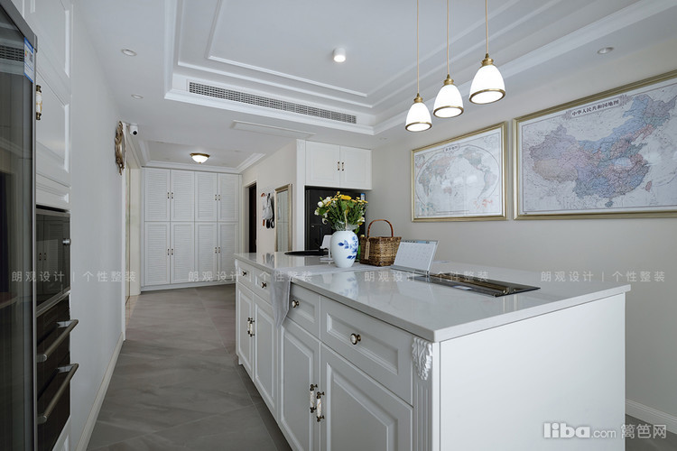 西厨与门厅相通,整个空间在素雅的基底中,用纯白的吊顶、米白色的中岛柜、带有丝丝纹理的花白色大理石,塑造出不同质感、不同层次的视觉感受,勾勒出空间的利落以及优雅。