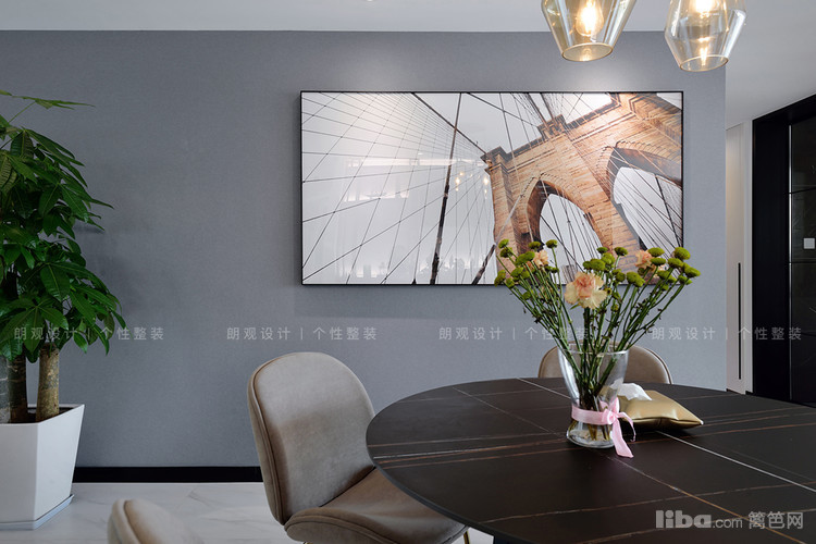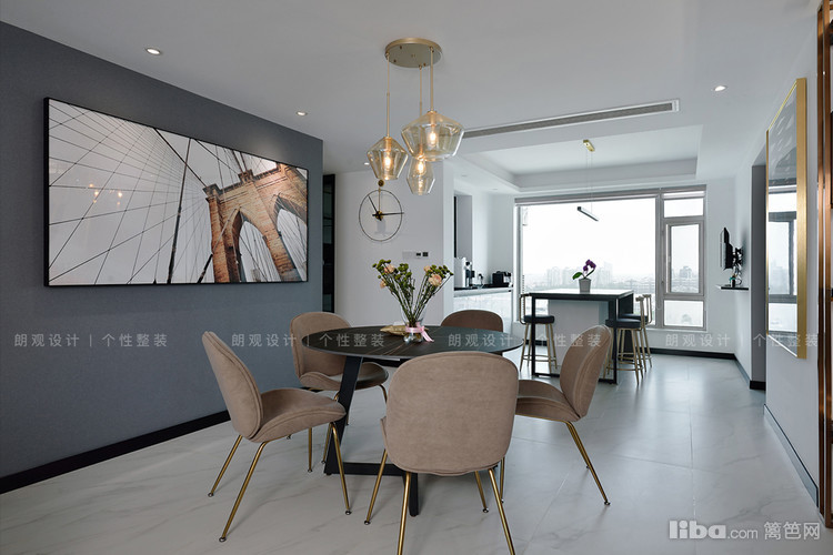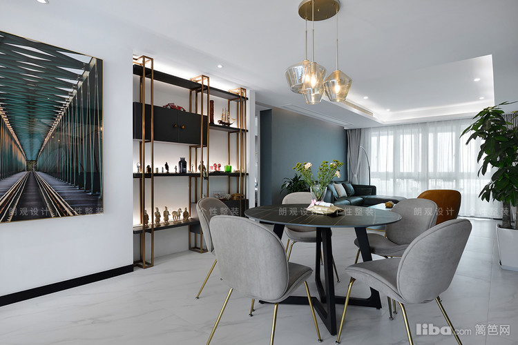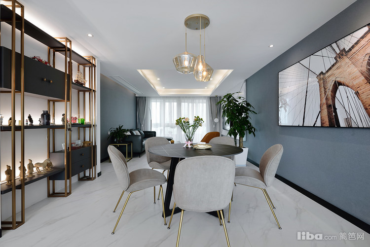 考虑到中国人的饮食文化,餐厅采用了大圆桌的形式,并且在秉承客厅灰调的基础上,灯具选择金属半透明琉璃装饰,瞬间让空间变得灵动而有生机。