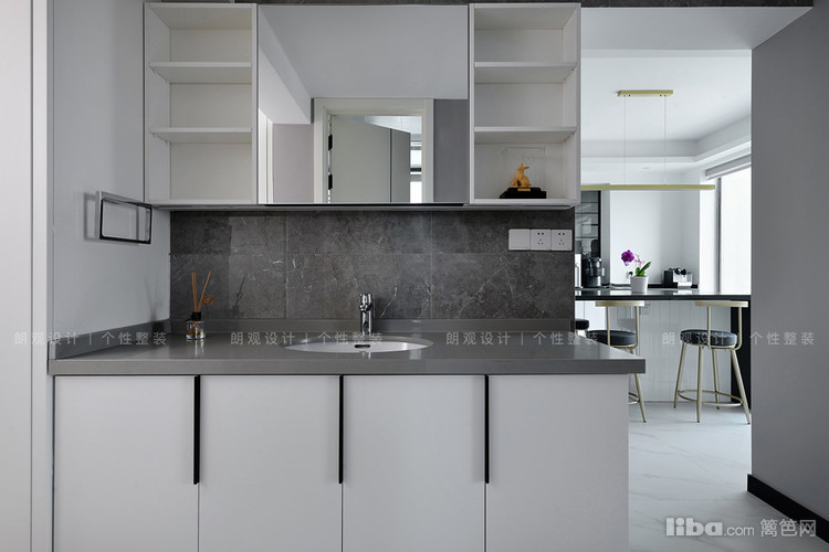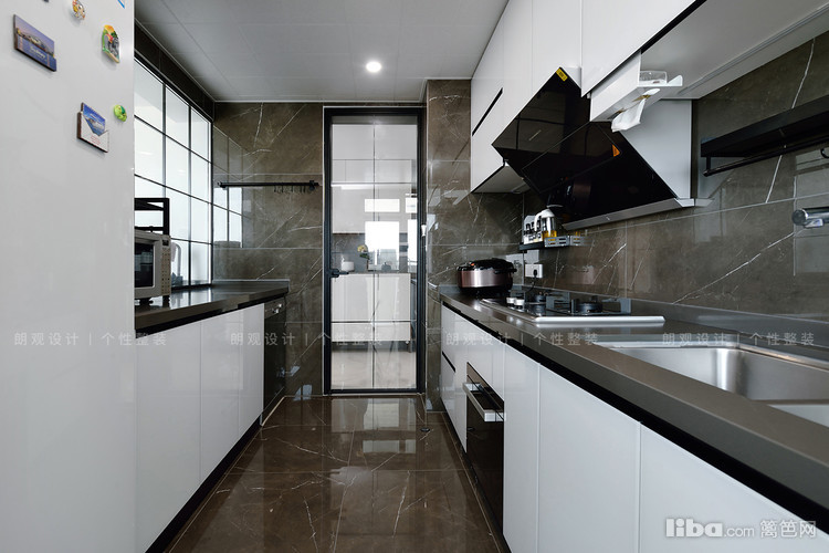 中厨深灰色瓷砖搭配白色微晶板橱柜,功能齐全,隔绝油烟的同时,颜值也很高!