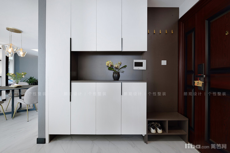 入户门厅巧借双开门的固定空间定制了玄关柜,鞋凳区域丝毫不影响开关门;鞋柜中间镂空部分方便进门随手放置包包等;柜体下部的留空设计,方便日常使用。