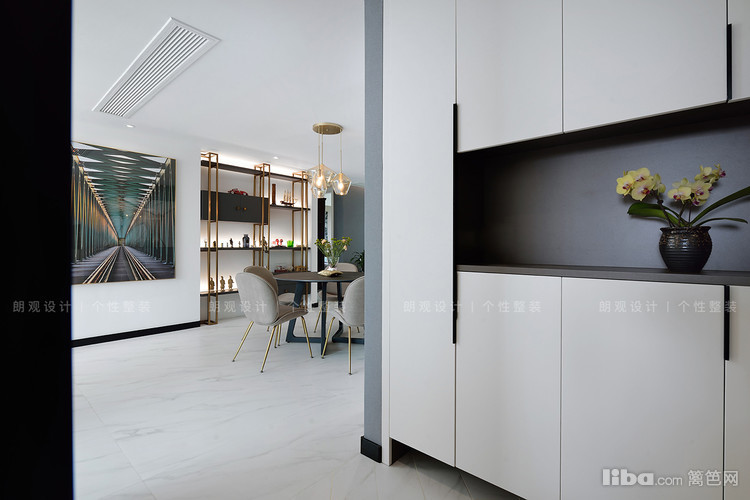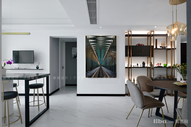 餐边柜拒绝板正的设计,定制而成的镂空金属展示架与金属吊灯摇曳呼应