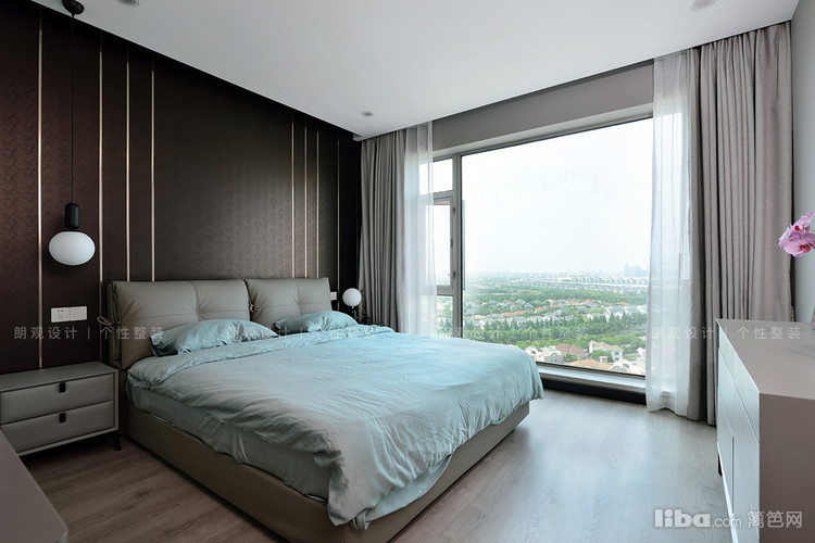 主卧以静谧时尚为主,大大的落地窗使阳光和景色倾泻而入,视觉效果非常赞!背景墙采用硬包设计,内嵌金属条,搭配硬包自带的肌理线条,为空间增添细腻灵动的情调。