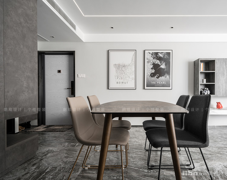 客餐厅均采用无主灯设计,拉伸空间感,四周分布的筒灯起辅助作用,而主角是吊顶内嵌的线条灯,布光均匀