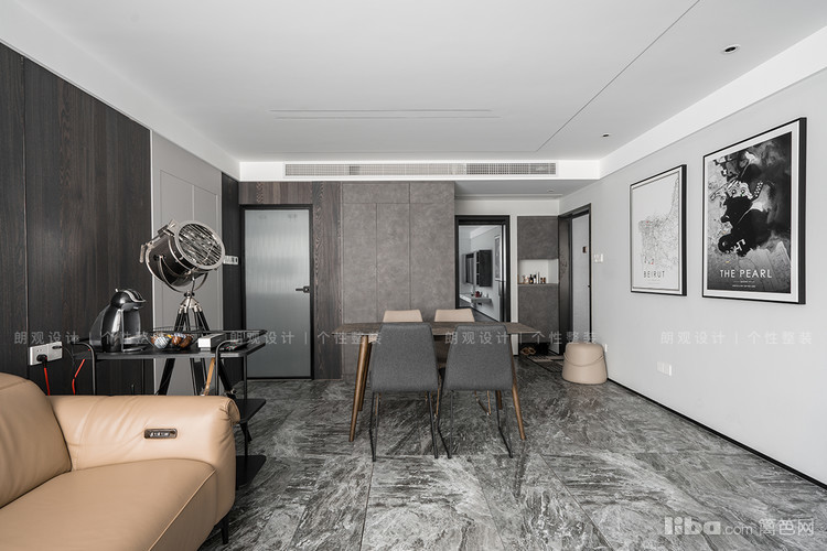 地面铺设极具视觉冲击的深灰色花纹地砖,粗犷的韵味与整体空间毫无违和感,反而增加整体空间张力。