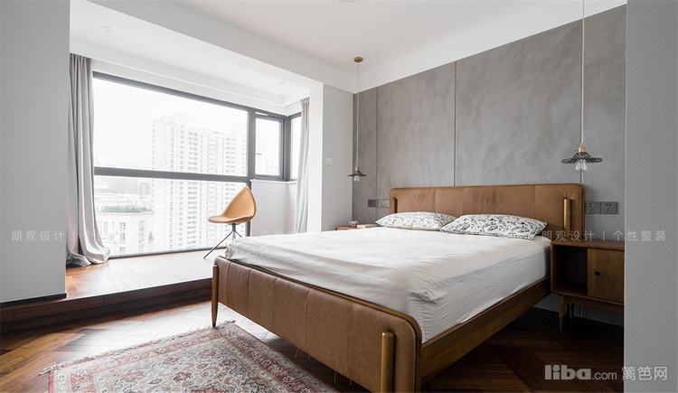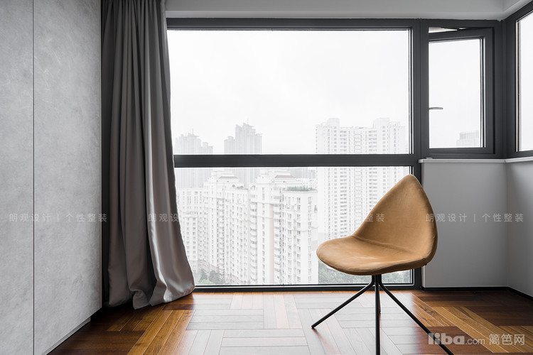卧室的生活阳台区,增加了地台设计,大面积的落地窗引入充足的自然光,用光线调和室内氛围