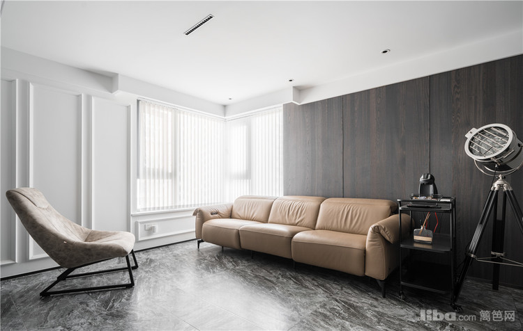 客厅采用大量的留白烘托出简约大气的设计风格。沙发背景用三块深色木饰面,增加客厅的纹理感,搭配黄色皮革软装,让整个空间塑造出炫酷时尚感的同时又有一种耐人寻味的深沉气质。