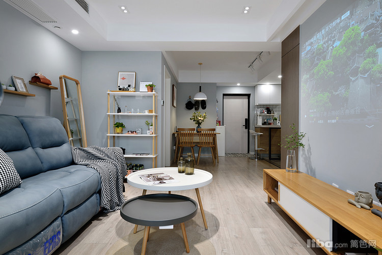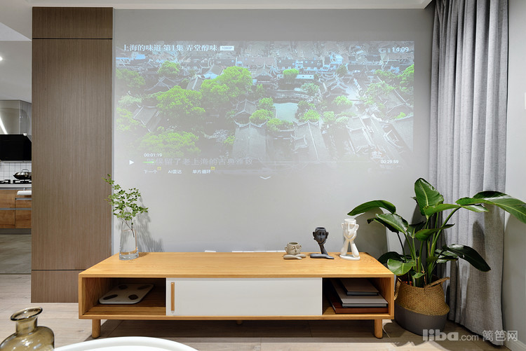 以投影仪取代电视,以开放式木制储物架替代传统的储物柜,美观又实用,搭配绿植葱翠,空间更显生机活力。