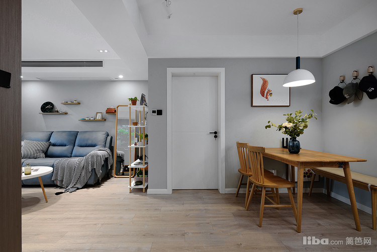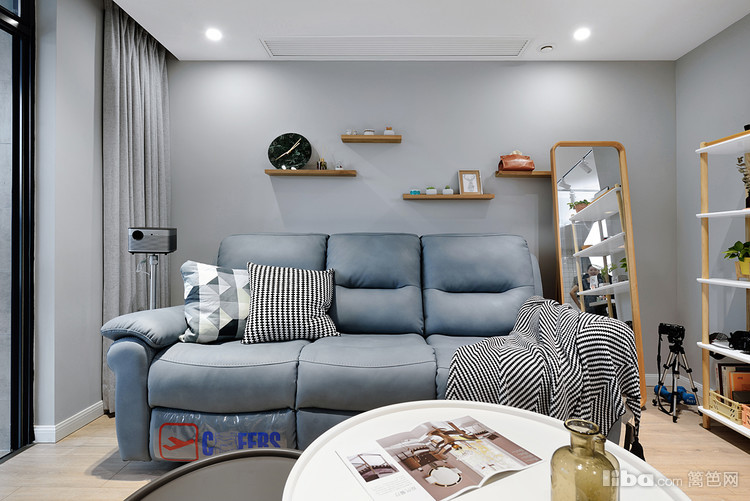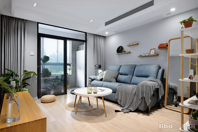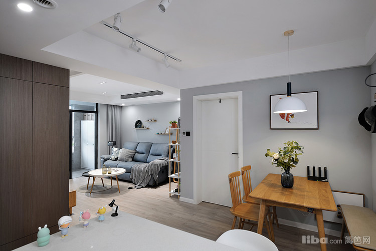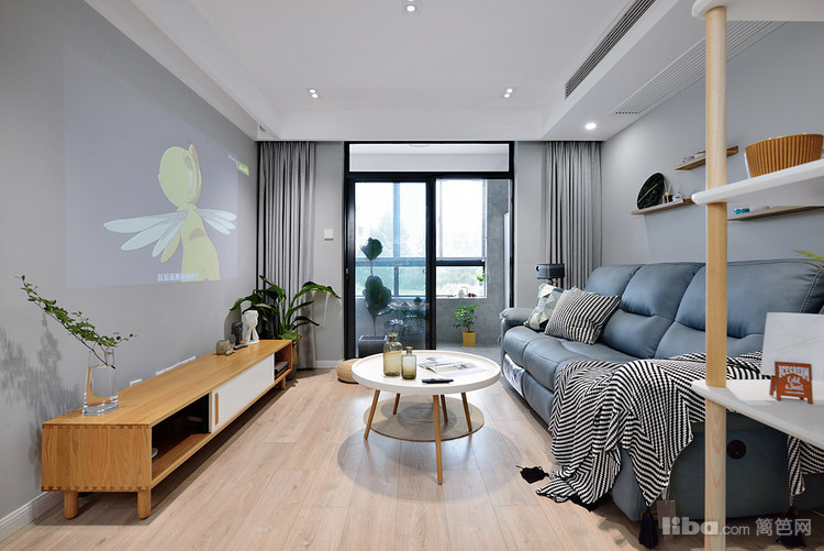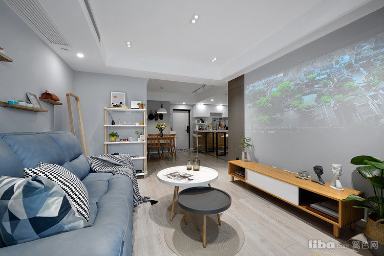 客厅墙体采用沉稳的浅灰色作主色调,搭配蓝色的功能性沙发,轻巧的木质家具,简约的装饰物,以简单的样貌给人一种舒适自由的感觉。