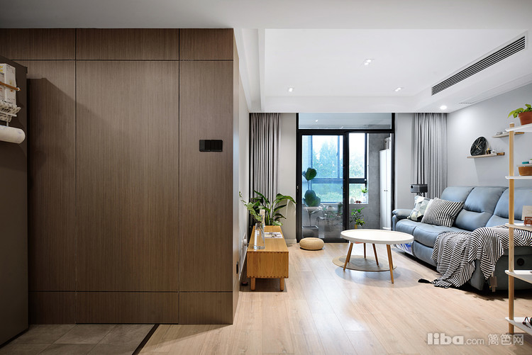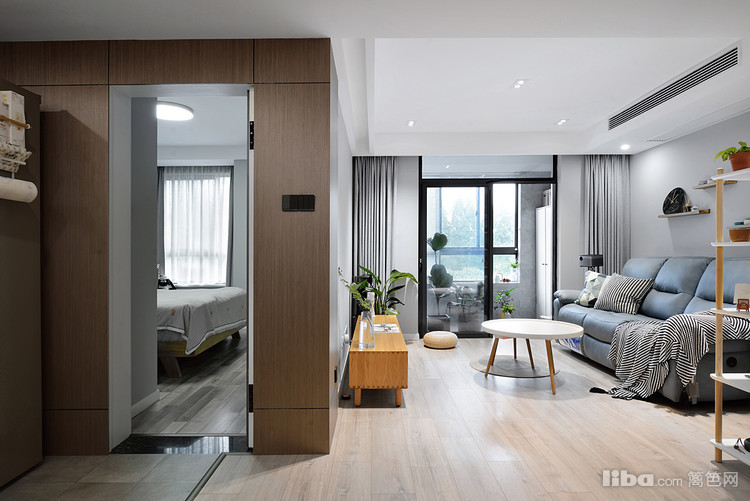 设计师利用隐形门解决进户门正对主卧门这一问题,同时背景墙采用了木饰面增加空间质感。