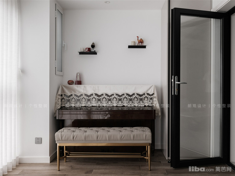阳台与客厅空间打通,用玻璃移门做隔断,让室内空间拥有足够的自然采光。通体的落地窗设计,将自然景致引入室内,闲暇之时弹奏一曲,硬朗的空间多了一份天然的舒缓。