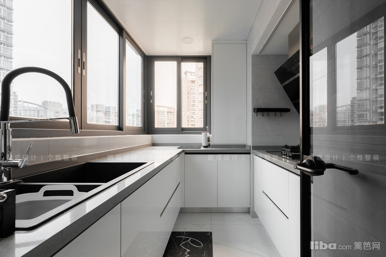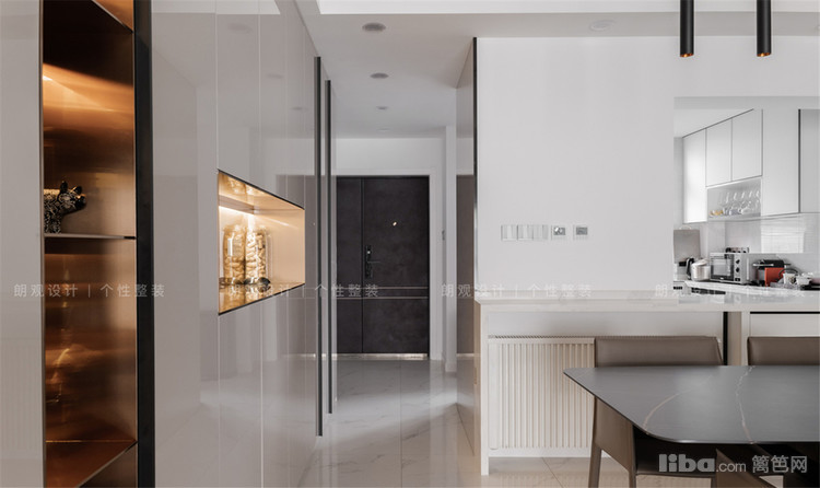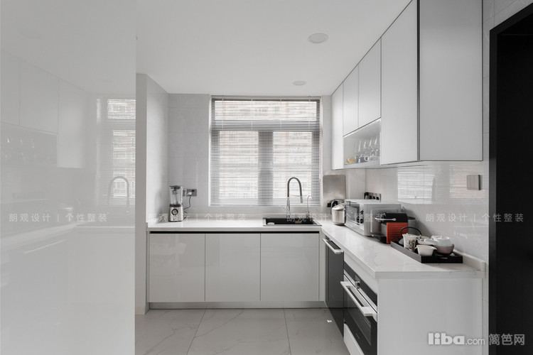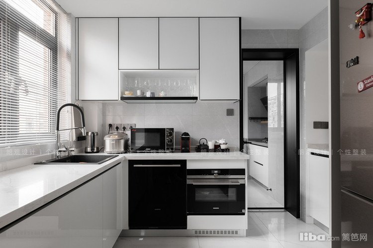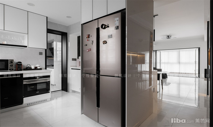 入户处的封闭式中厨改造成开放式西厨,西厨的橱柜全部选用了白色系,与客厅的留白极简设计相呼应,搁置各种厨房电器,既可以制作简单的西点,又避免遭受油烟的侵害。