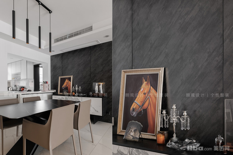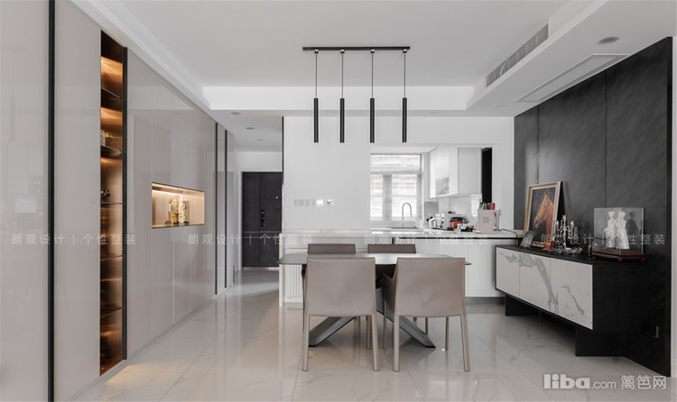 与客厅的极简风格相比,餐厅似乎热闹了很多。西厨与餐厅之间利用原门洞增加了吧台设计,保证两个空间的互动性,正好还可以隐藏墙面的暖气片,实用性与美观并存。