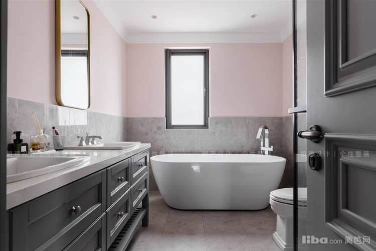 主卫设置在三楼主卧套间内,地面和墙体通铺浅灰色的瓷砖,粉色防水涂漆对墙体进行修饰,为卫浴空间增加甜蜜浪漫的氛围。