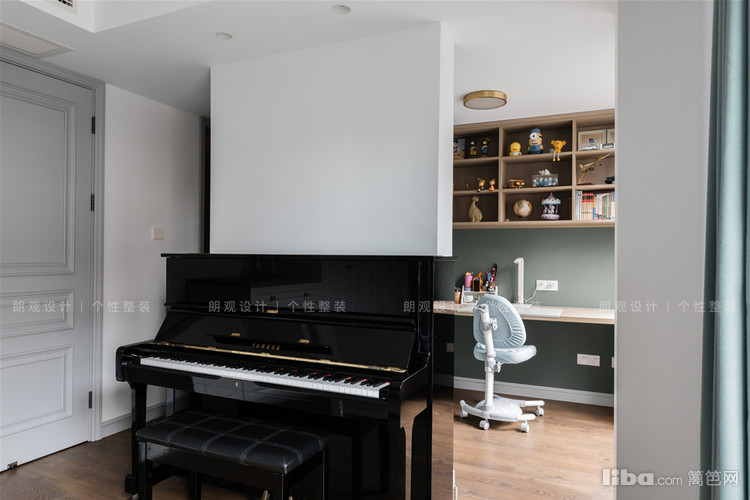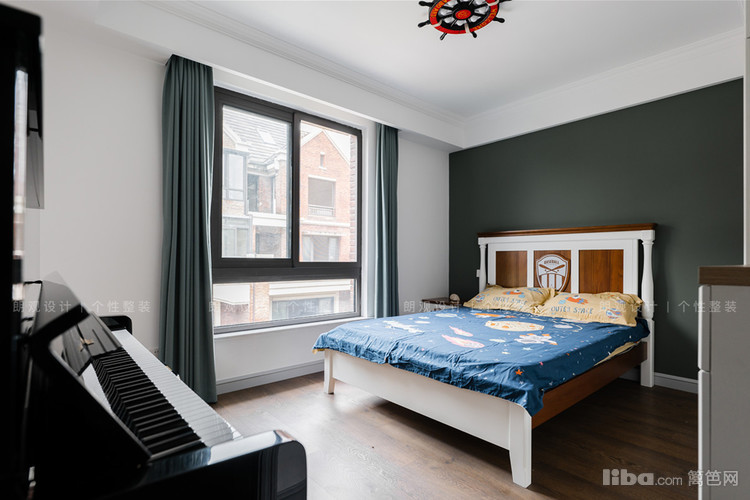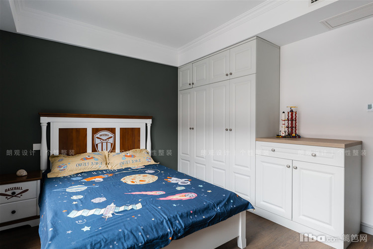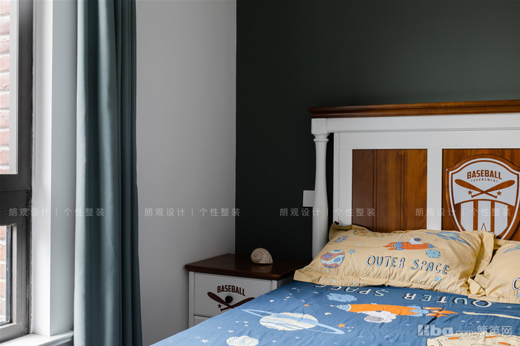儿童房设计注重孩子成长所需的独立空间,床背景用以深绿色,营造沉稳静谧的学习以及休息氛围。