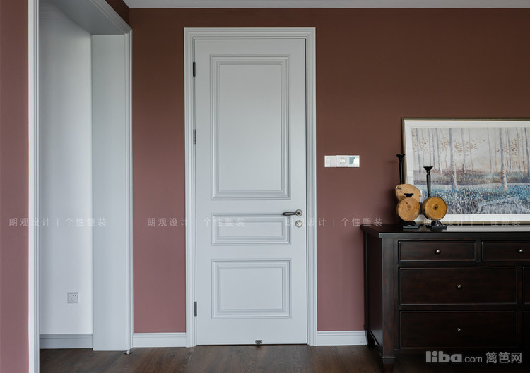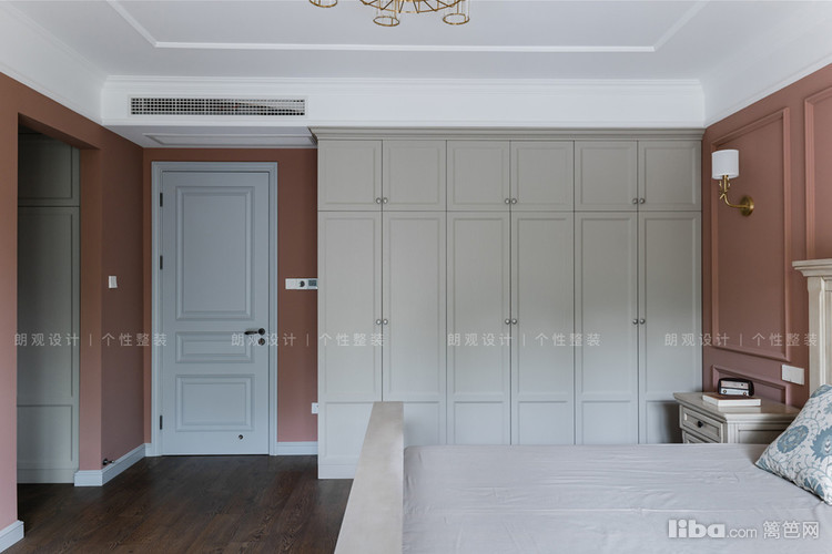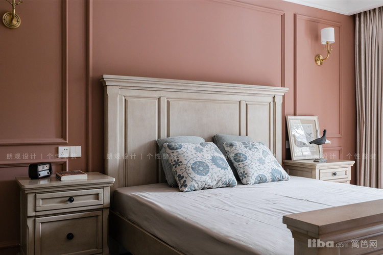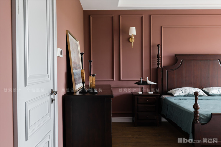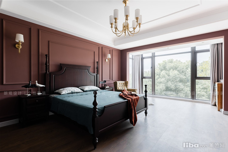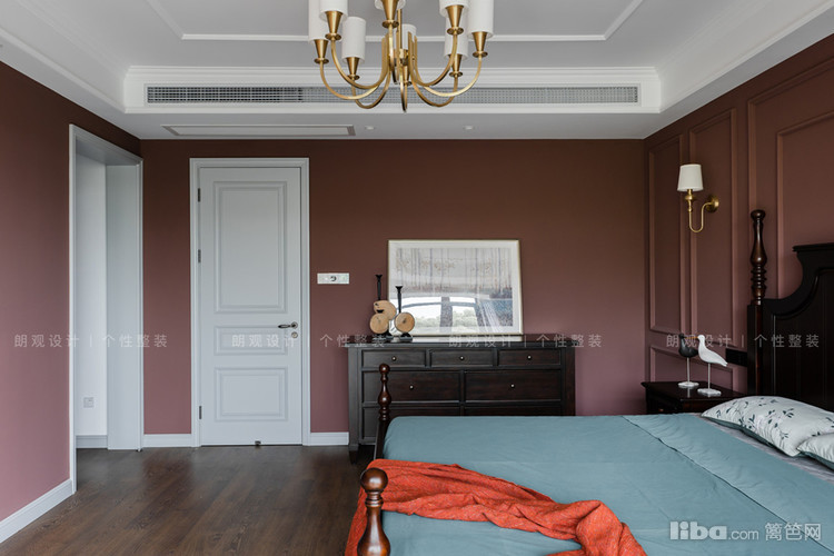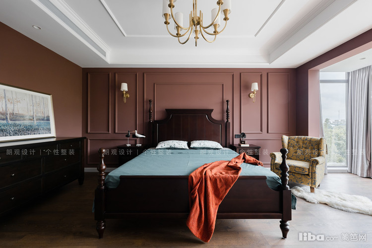 主卧整个空间用暗红色做主色调,渲染了一种浪漫氛围,墙体用石膏线美化后,空间的立体感凸显,搭配立柱床,增添美式风格的独有的韵味。