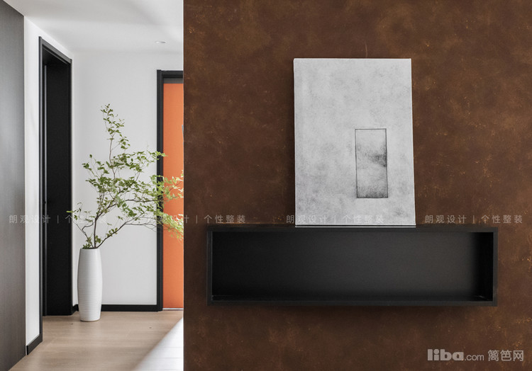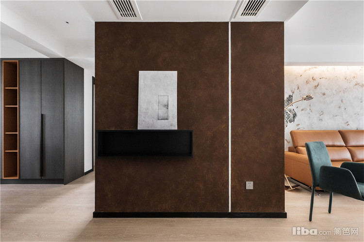 进门一堵铁锈红般的玄关墙给人眼前一亮的新鲜感,斑驳的纹理释放出另类的时尚气质。从玄关转入客厅,沙发背景墙突破常规,以独特的艺术漆纹路为底,搭配橙色皮面沙发,文艺感迎面而来。