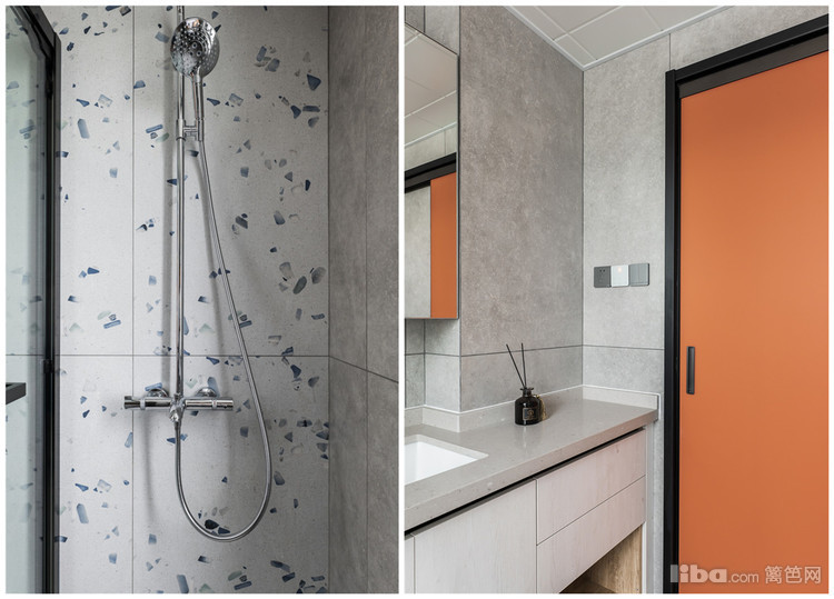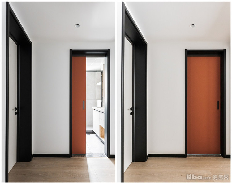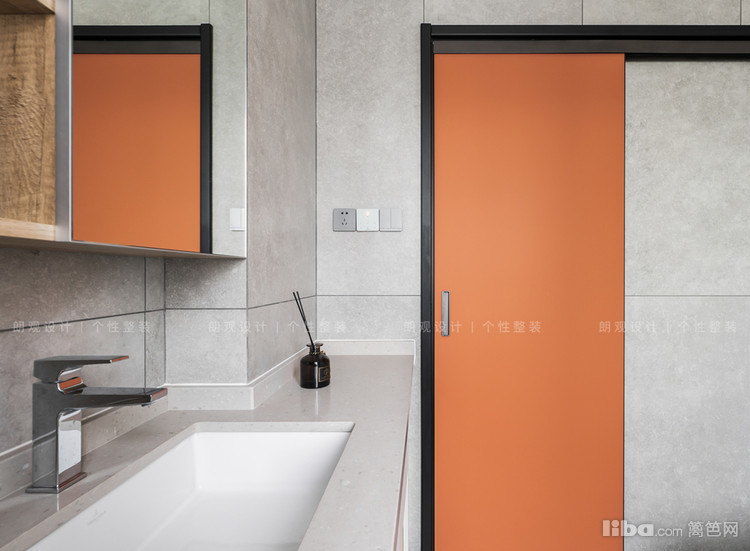 卫生间属于实用型空间,但颜值也要杠杠的,业主舍弃传统卫生间套门,以鲜橙色的推拉门点亮空间。