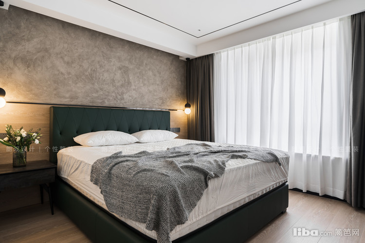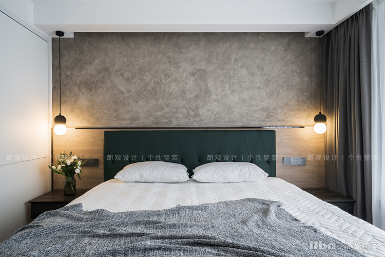 主卧背景墙面一分为二,上部分以艺术漆做装饰,下部分采用“地板上墙”的设计手法,视觉上延伸地面空间,有着特殊的装饰效果,也让整个墙面不至于太过单调。