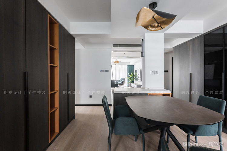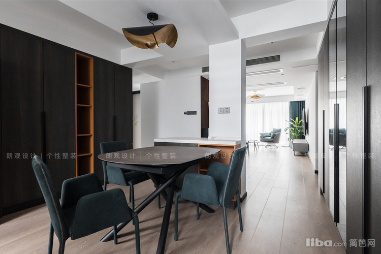 餐厅区域有一处承重墙,设计师顺势借用承重墙定制了边岛提升空间利用率。线条简洁的黑色餐桌,搭配着顶部的黄铜吊灯,营造出了一个时尚而不失温馨的就餐氛围。