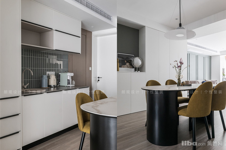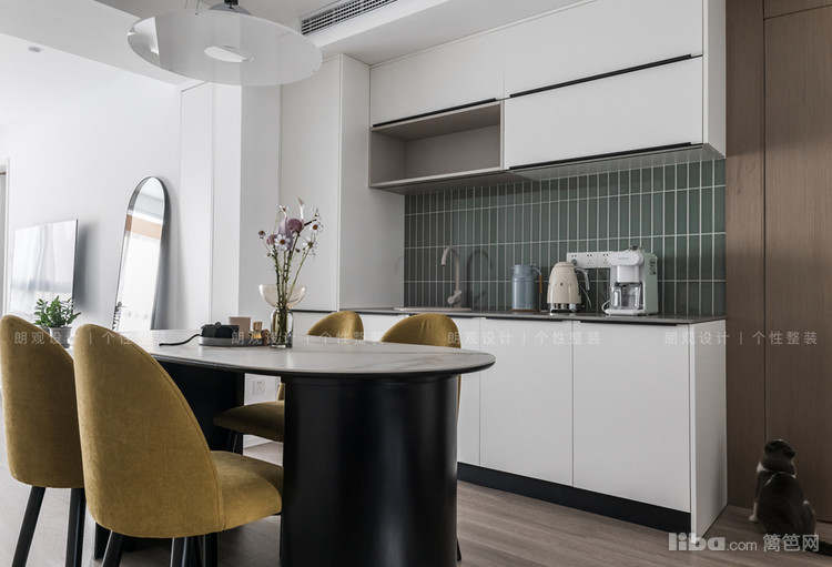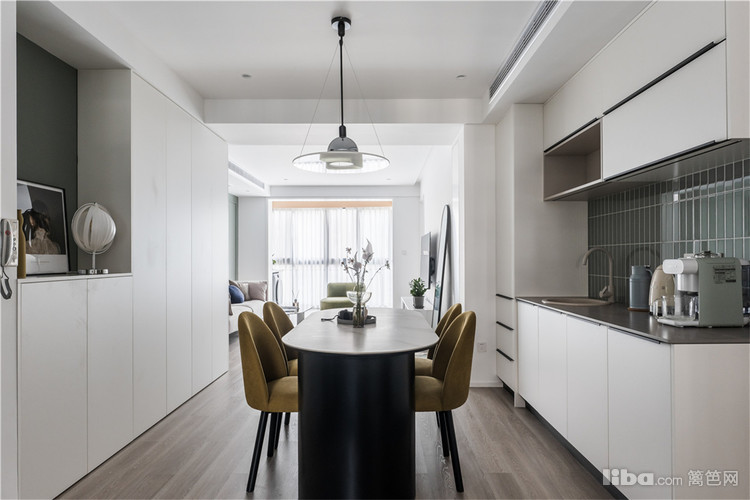 客餐采取一体化开放式布局设计,以薄荷绿为引子,实现客餐厅的空间延续,同时依然保持餐厅功能区域的独立,强大的储物空间,清晰流畅的动线,营造了流动性的空间氛围。