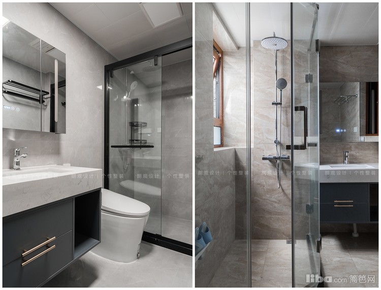 卫生间延续轻奢风,墙面与地面通铺浅灰色瓷砖,增加小空间的整体性,搭配深灰色柜体和镜面柜,干净利落又不失时尚感。