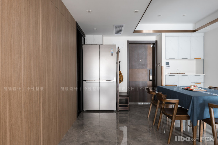 厨餐之间采用玻璃推拉门,其余墙面统一采用木饰面+隐形门设计,维持餐厅区域的整体性