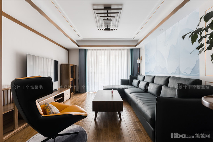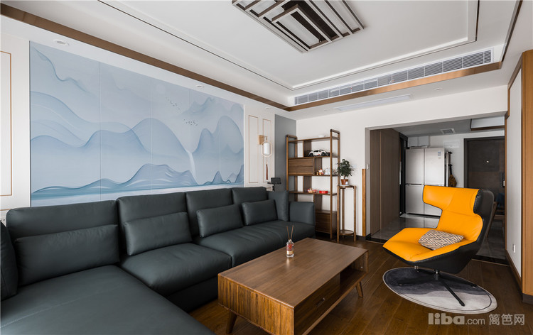 客厅讲究山水天境,自然韵律,想要在简约的空间中呈现出新中式的清雅意韵,沙发背景无疑是整个空间的重头戏。用硬包形式将山水画作拼接,化繁为简,将东方美学用现代手法巧妙地呈现
