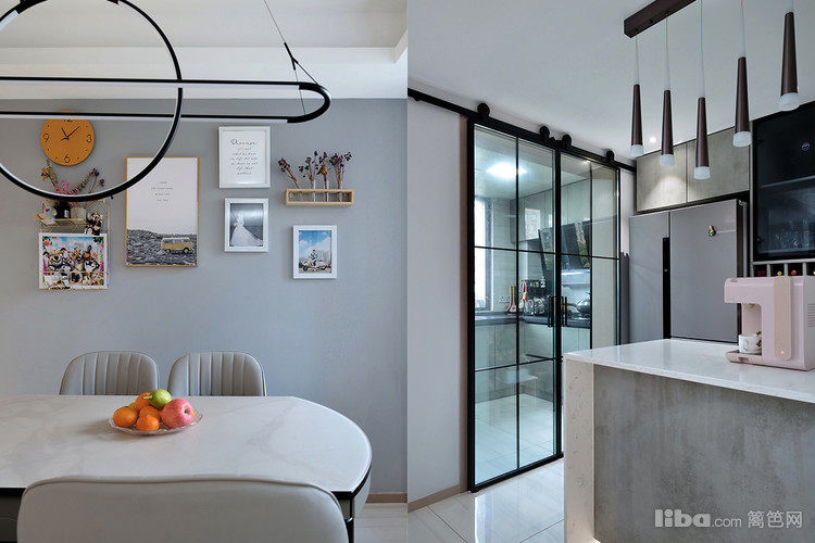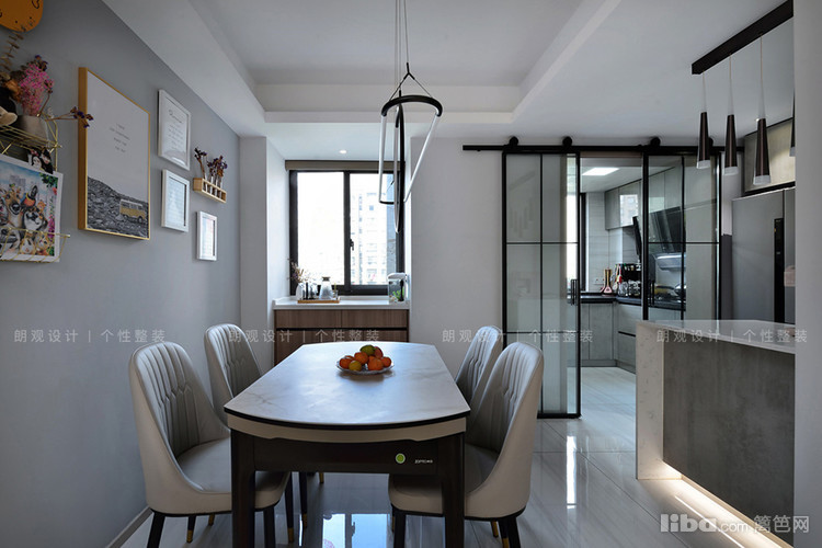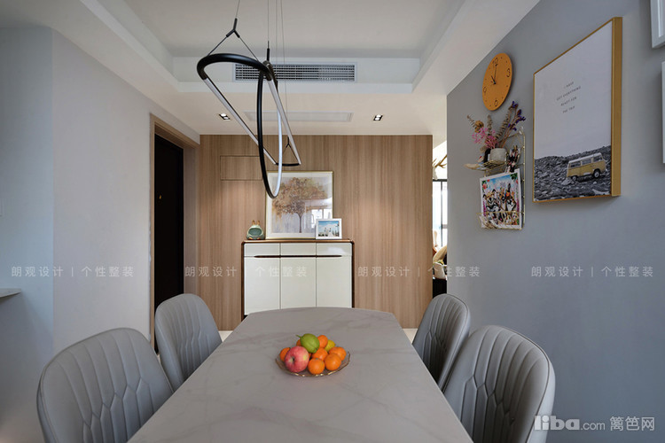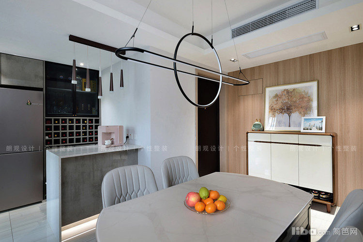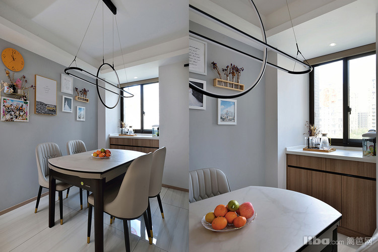 餐厅设计兼顾美观和实用性,背景墙采用高级灰做基地,无需多做修饰,简单的生活照和独特的吊灯做装饰,即可装饰一家人幸福的生活氛围。