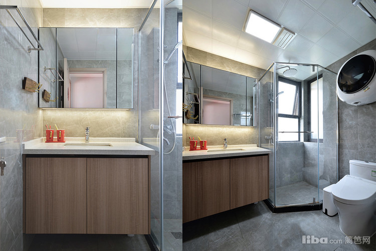 卫生间以灰色大理石纹理的瓷砖与原木材质的淋浴柜搭配,不同的肌理感在小空间散发着独特的美感。同时为保证空间的流畅动线,选择了镜面柜和钻石型淋浴房,进行虚实之间空间延展。