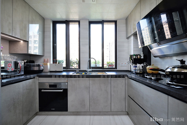 中西厨之间利用外挂式上轨道玻璃移门做隔断,形成一个视觉开放与行为独立并存的空间。厨房内部,选择上下分离式橱柜设计+U型设计,最大限度利用空间,满足业主烹饪需求。
