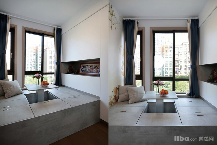原窗边的小阳台纳入餐厅区域,并定制储物柜,不仅增加了餐厅储物空间