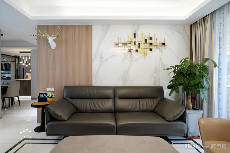 沙发立面以木饰面和石材两种材质做拼接,同一空间利用不同材质的碰撞增加空间层次,同时顶面局部吊顶内嵌灯带,搭配华丽的吊灯,视觉上拉升空间层高,让空间更为立体。