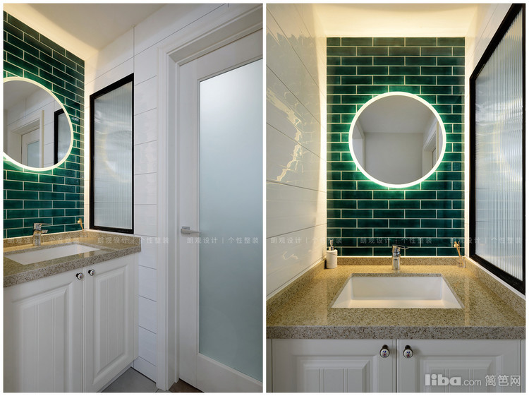 卫生间干湿分离设计,干湿区之间用长虹玻璃做隔断,同时墙面采用色彩跳跃的孔雀绿提亮空间,并在墙面预留灯带,搭配自带灯光的圆形镜,改善采光问题。