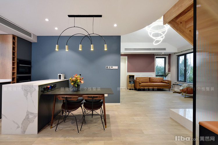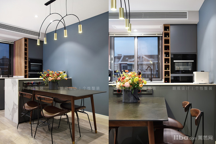 合理安排楼梯位置后,利用吊顶形成现有的独立开放式餐厅区域。为了满足业主想要的中西厨功能,在窗户位置增加了西厨操作台和高柜设计,可以弥补厨房面积不足的遗憾。