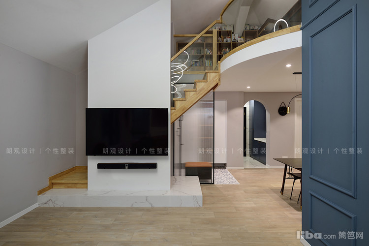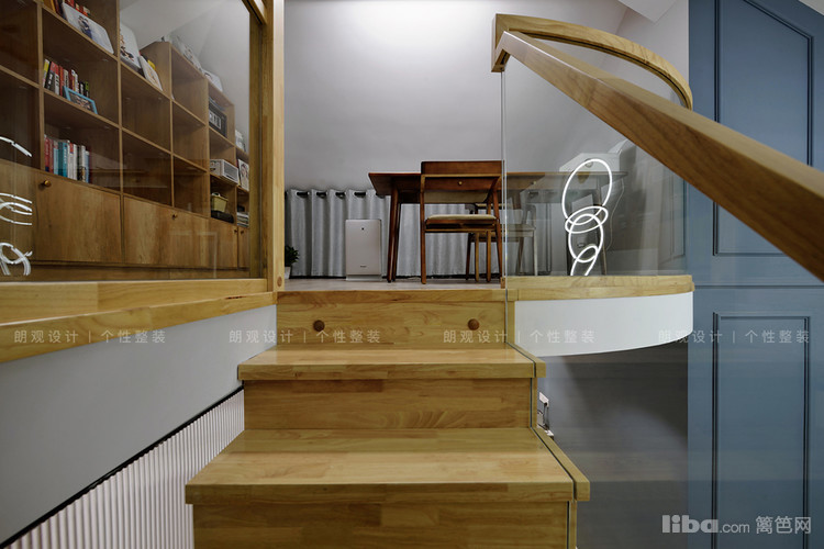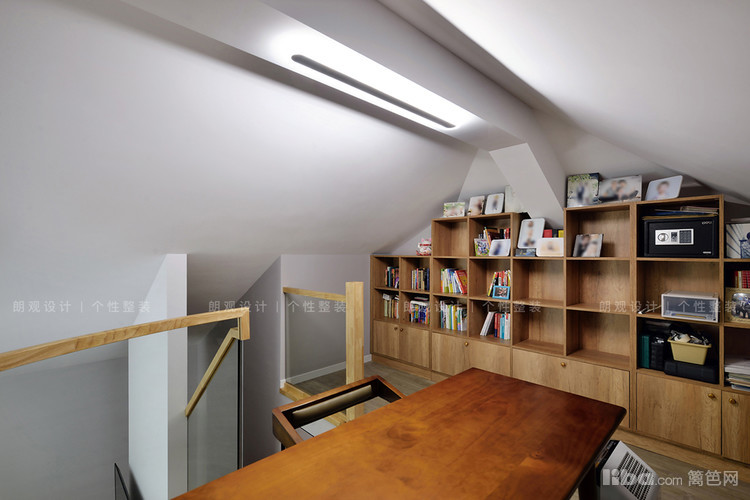 拾阶而上就是阁楼区域,设计师将其作为全家人的书房。为保证孩子上下楼梯的安全,楼梯踏板和扶手采用原木设计,同时以玻璃做栏板,确保室内的光线流动。
