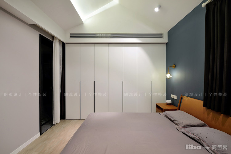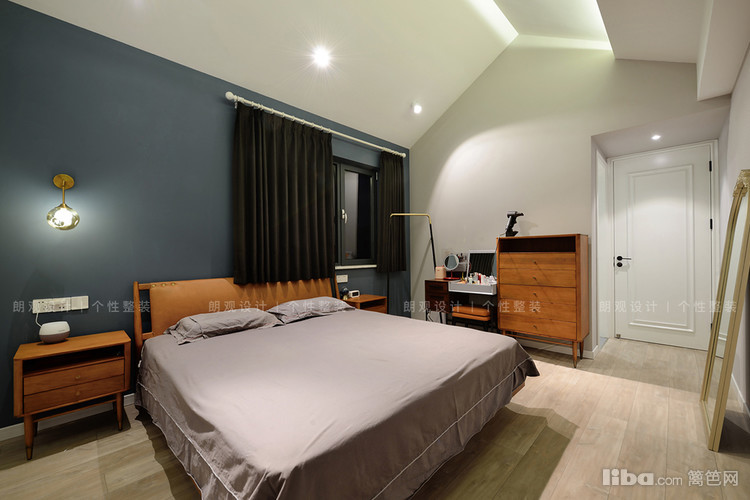 卧室顶面同样保留斜面造型感,大气简约的无主灯设计配合筒灯和灯带,轻松打造舒适无压的休憩氛围。