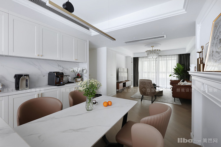 餐厅将北阳台纳入,定制柜既可以放置小家电,又充当餐边柜的作用,储物空间大增;中岛与餐桌结合,特意多出的操作台又可作为吧台使用,功能与颜值兼顾。