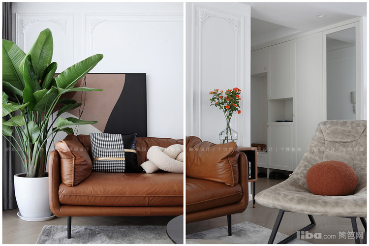 为了保证大面积的白色不产生审美疲劳,软装上选择了色调较暗的橘色皮质沙发和翠绿的植物做调和,使得客厅在明净简约的基础上,又带有一些灵动的变化。