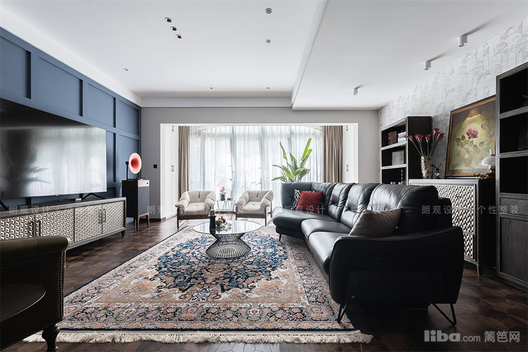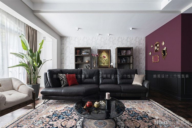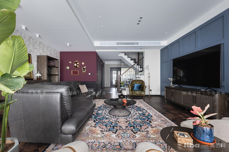 客厅选择绛红色和蓝色作为主色调,打造时尚优雅的复古感。无主灯设计与各种点光源、落地灯共同打造全景灯光设计, 在简练的空间中增添时间流动的维度,为业主打造多层次的生活氛围。