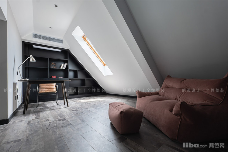 结合三楼层高,通过现浇水泥搭建出阁楼空间作为儿子的书房。定制的书柜遵照别墅特有的顶面造型,搭配慵懒的沙发,形成极具个人特色的小空间。