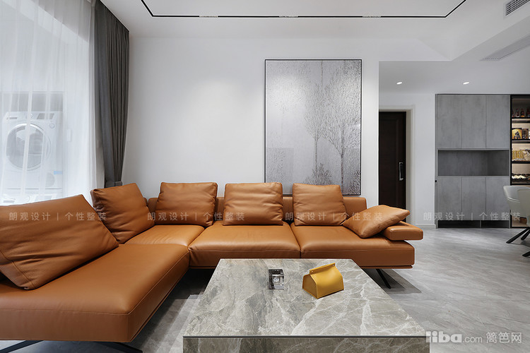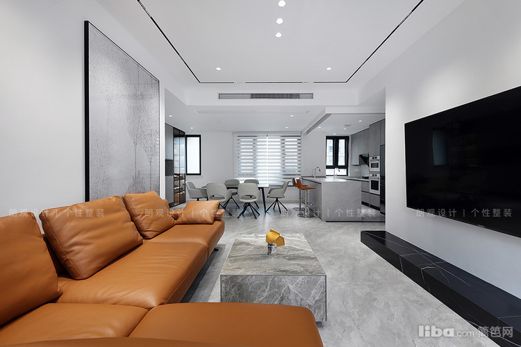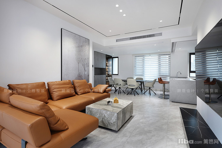 整体开放式布局,使得空间更通透明亮,给人一种大平层的视觉感。为防止开放空间内功能区叠加的厚重感,以白色贯穿整个空间,黄色皮质沙发局部提亮,成功为空间“减负”,营造一种轻盈的空间感。