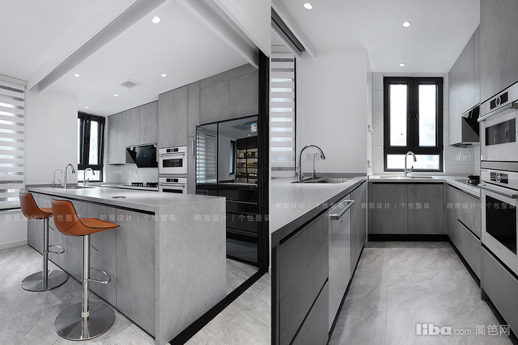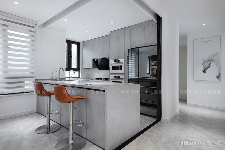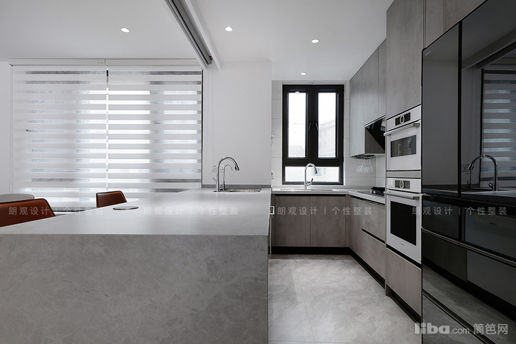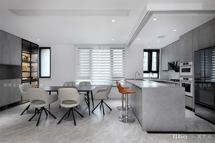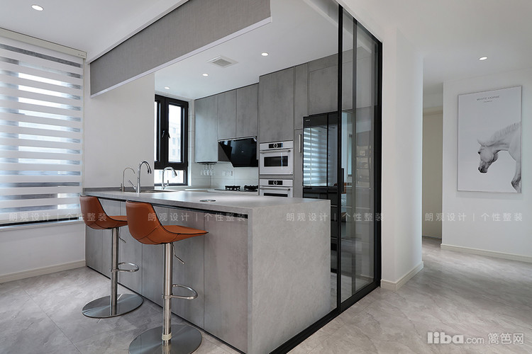 厨房定制超长中岛,增加操作台面和储物空间,与橱柜平行布局,让厨房形成“二”字形。同时,厨房用卷帘和玻璃推拉门做隔断,防止爆炒时油烟侵蚀其他空间。