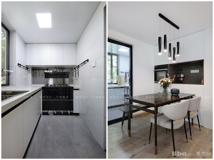 餐厨之间以玻璃推拉门做隔断,有效隔绝油烟,还不占用空间。厨房内部整体白色设计,墙面白色瓷砖与白色橱柜,打造干净通透的下厨空间,角落内集成灶与橱柜的完美衔接,保证了厨房空间的整体性。