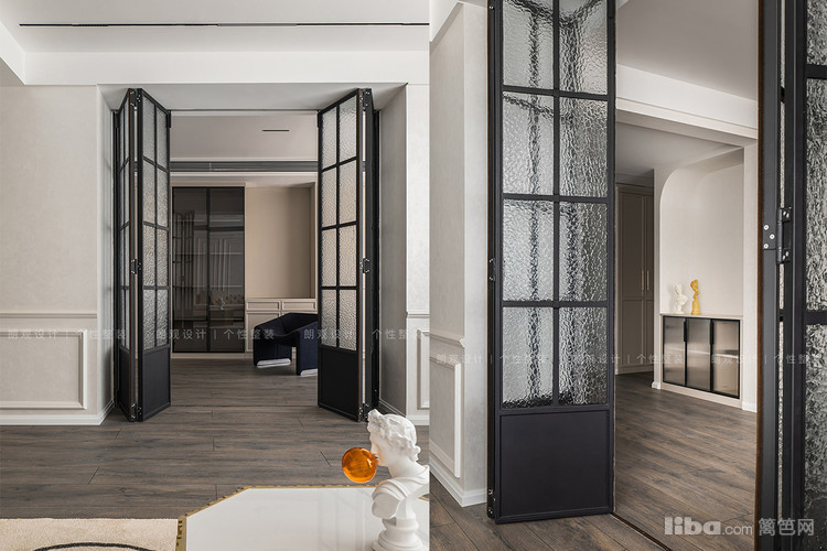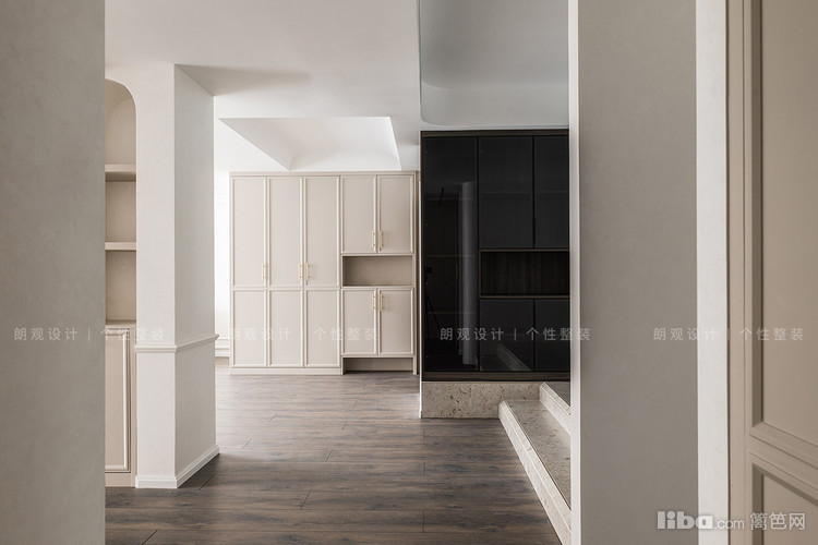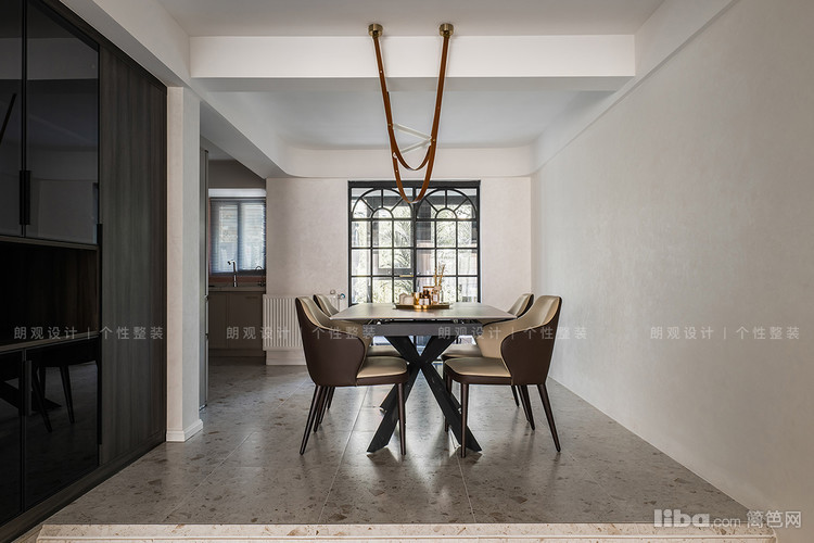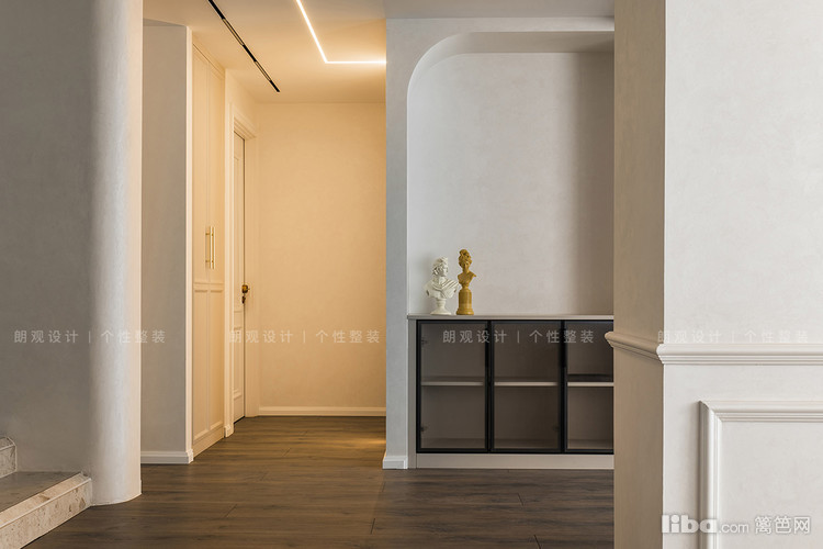 从过道可窥见设计师对于不同区域的衔接,玄关柜和餐边柜在不同区域承担起各自的储物功能,却可以在其他角度呈现出延续承转的视觉感,柔和的过渡两大空间。
