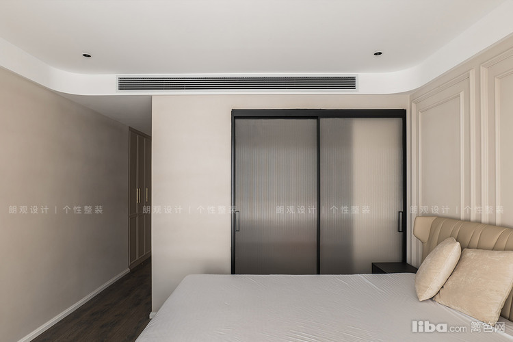 主卧的设计手法与客厅保持一致,经过格局调整舍弃了原衣帽间,但设计师将休息区和卫生区重新调整布局,划分为三部分,又增加了小型衣帽间,满足储物要求。